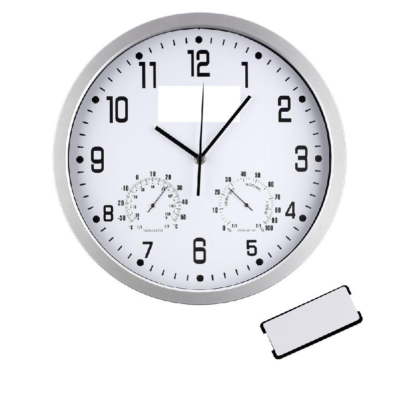 Классические настенные часы с термометром и гигрометром. В верхней части циферблата находится планка для нанесения логотипа, которая легко извлекается с тыльной стороны корпуса.
