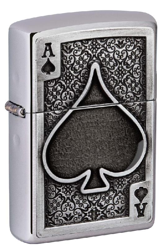 В чрезвычайно популярную коллекцию зажигалок с тузами добавлен еще один дизайн! Пиковый туз вырезан на прочной эмблеме и прекрасно сочетается с зажигалкой Brushed Chrome.