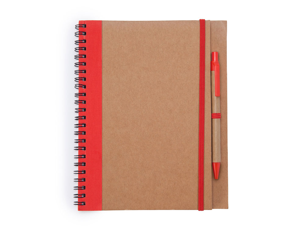 Блокнот на спирали с жесткой обложкой из переработанного картона. Включает шариковую ручку с синими чернилами. 60 простых листов.
