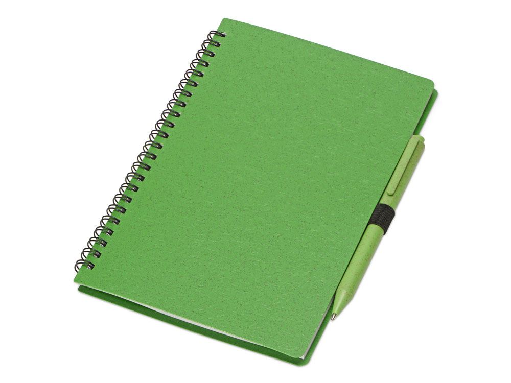 Блокнот с обложкой из переработанной пшеницы и пластика. Блок состоит из 80 листов переработанной бумаги белого цвета. Крепление - пружина. В комплекте шариковая ручка в тон блокноту из пшеничной соломы.