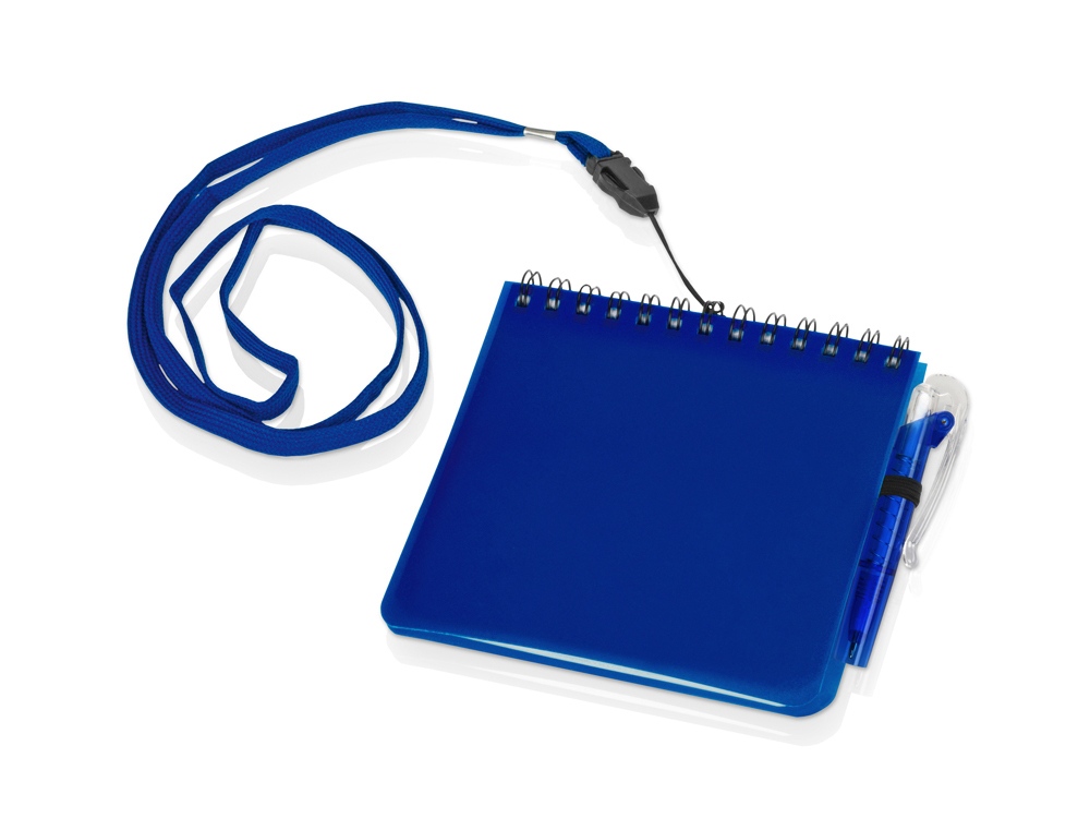 Яркий блокнот с шариковой ручкой можно носить на шее благодаря специальному ремешку. Отличный промо-сувенир, на обложку которого можно нанести логотип.