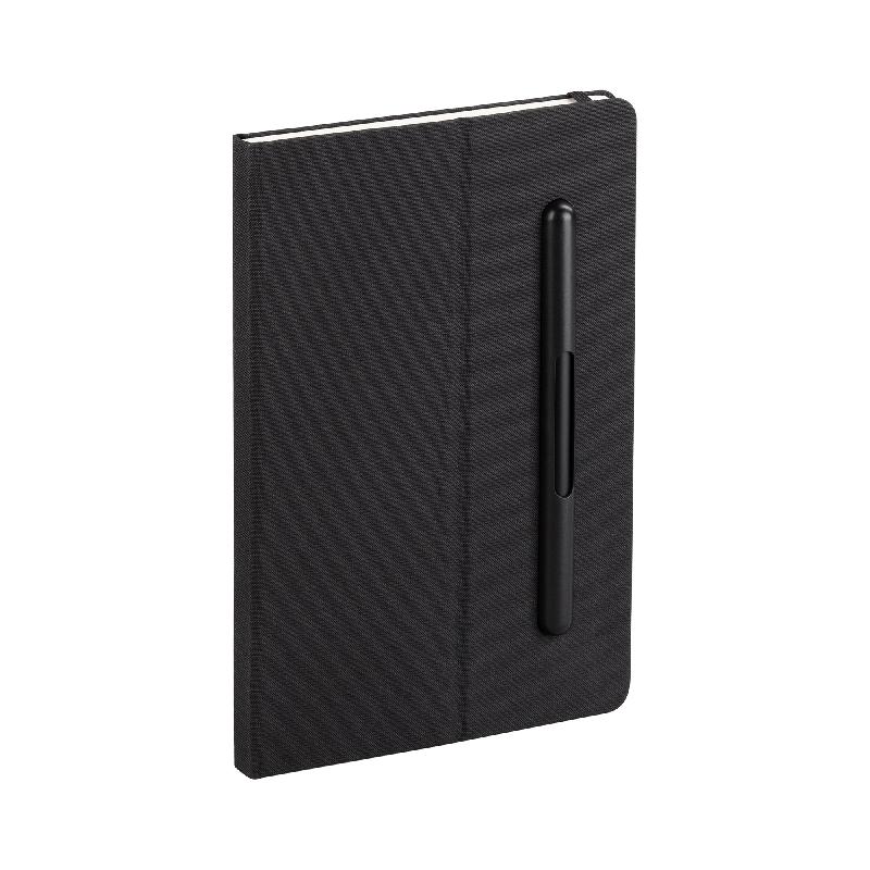 - Блокнот формата А5 с резинкой-фиксатором и встроенным пеналом под ручку-карандаш. Внутренний блок состоит из 160 страниц в линейку кремовой бумаги плотностью 80 г/м2. Через окошко пенала можно видеть нанесенный на ручку-карандаш логотип.