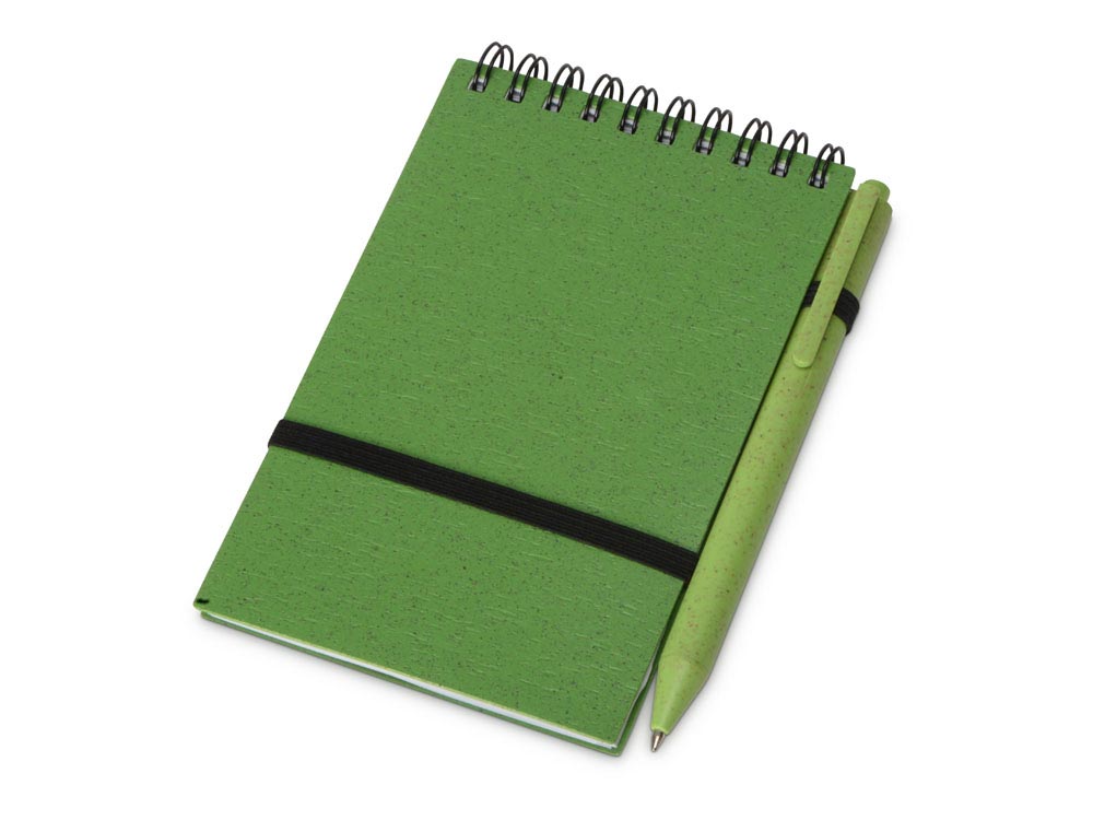 Блокнот с обложкой из переработанной пшеницы и пластика. Блок состоит из 60 листов переработанной бумаги белого цвета. Крепление - пружина. В комплекте шариковая ручка из пшеничной соломы.