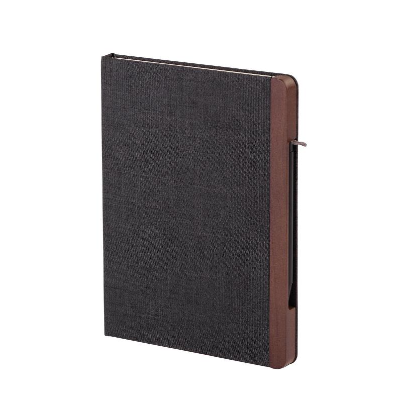 В блокноте 160 страниц в линейку кремовой бумаги плотностью 80 г/м2. Материал текстильной обложки изготовлен из переработанного (RPET) пластика. Ручка с синей пастой, стержень легко заменить.