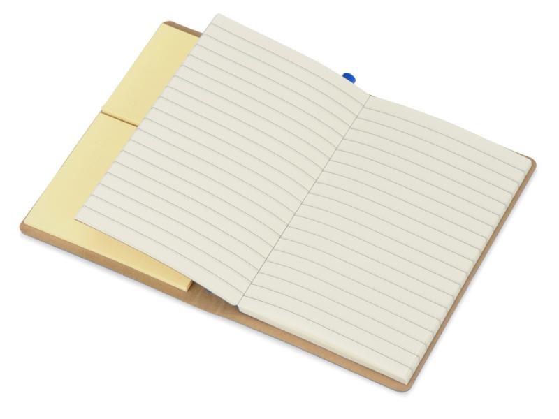 Компактный набор включает в себя разноцветные стикеры разных размеров, блокнот с линованной бумагой и ручку c корпусом из переработанного картона. Обложка выполнена из фактурной искусственной кожи, которая, при тиснении, меняет цвет на более глубокий.