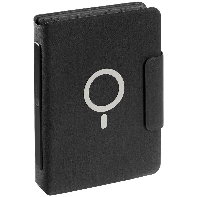 Органайзер с блокнотом и аккумулятором с беспроводной зарядкой. Обложка с фактурой, имитирующей ткань, на магнитной застежке.