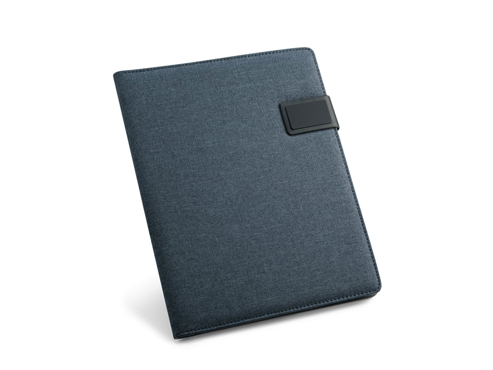Папка A4 из искусственного льна и кожзаменителя. Имеет застежку на магните с пластинкой для персонализации. Внутри имеет блокнот из 20 листов в линейку, держатель для шариковой ручки (ручка не входит в комплект), карман для смартфона и держатели для кабелей или других принадлежностей (в комплект не входят). 233 x 310 x 18 мм | Пластина: 50 x 30 мм. Вид нанесения, рекомендуемый поставщиком: трансфер, гравировка.