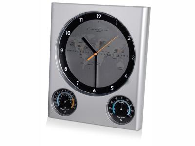 Настенная погодная станция оснащена часами, гигрометром и термометром. На фоне циферблата расположена карта мира. Отличный вариант для подарка коллегам по работе.