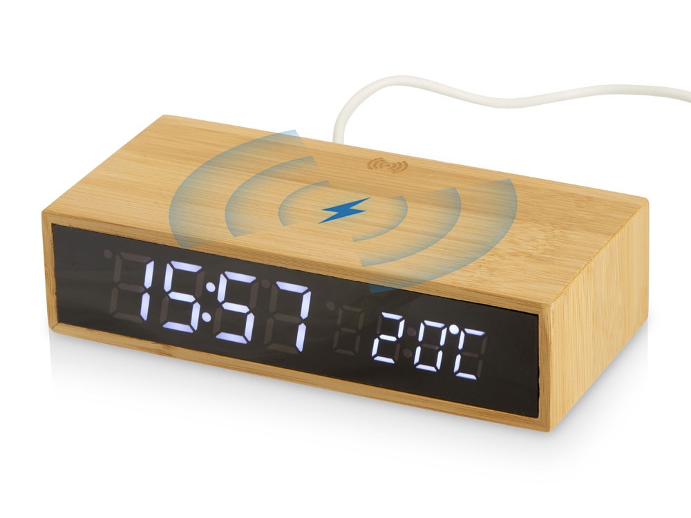 Настольные часы с корпусом из бамбука, имеют функцию беспроводной зарядки для смартфонов (10 Вт). Яркий дисплей. Функция измерения температуры окружающей среды.