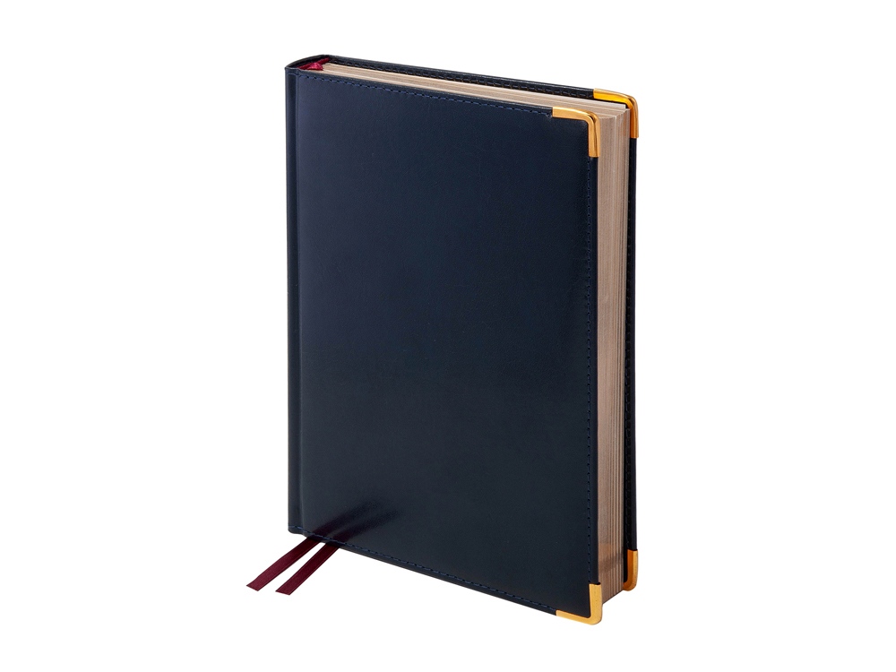 Классический деловой ежедневник линии Imperium в обложке из черной рециклированной кожи – образец элегантности. Гладкую тонкую фактуру кожи подчеркивает декоративная строчка по контуру и металлические закругленные уголки под золото. Респектабельность и роскошь этого ежедневника усилена за счет металлизированного золотистого обреза и бордовых шелковых ляссе.