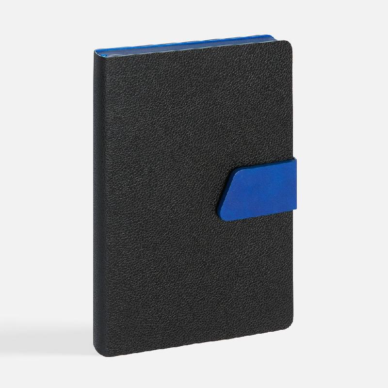 Ежедневник с гибкой обложкой, выполнен из материала La Fite, черный АА и Nubuck Touch, голубой, дополнен голубым ляссе и хлястиком на кнопке.