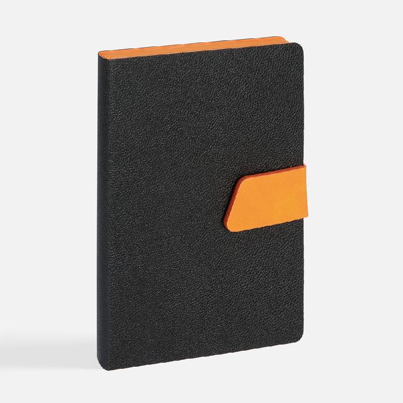Ежедневник с гибкой обложкой, выполнен из материала La Fite, черный АА и Nubuck, красный РР, дополнен красным ляссе и хлястиком на кнопке.