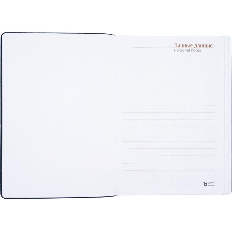 Гибкая обложка ежедневника выполнена из материала Latte, темно-синий XX. Внутри корешка — специальное место для крепления ручки размером до 15х0,9 см.