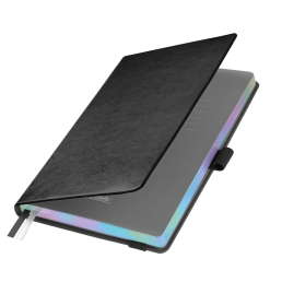 Недатированный ежедневник в жесткой обложке из качественной искусственной кожи. Материал обложки гладкий, текстурированный, с полуглянцевым блеском. Скругленные углы обложки и внутреннего блока. Отличительная особенность коллекции — голографический фольгированный срез блока. Форзац/нахзац– серые. Вариант в жесткой обложке украшен широкой вертикальной резинкой-фиксатором с вставкой из ПУ-материала обложки и петелькой под ручку, а также двойным ляссе (серым и в тон обложки).