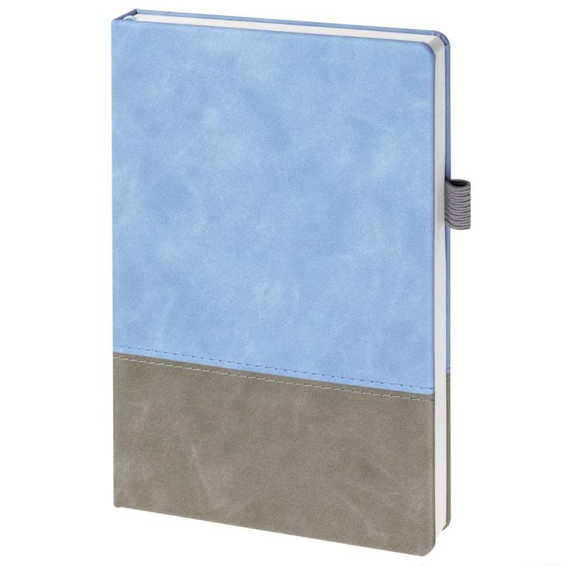 Ежедневник с твердой обложкой, без поролона, со сшивкой материалов Nubuck Touch, серый СС, и Nubuck Touch голубой JJ, дополнен двойным ляссе и петлей-резинкой для ручки.