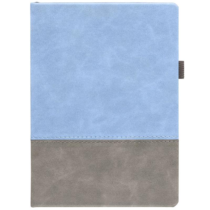 Ежедневник с твердой обложкой, без поролона, со сшивкой материалов Nubuck Touch, серый СС, и Nubuck Touch голубой JJ, дополнен двойным ляссе и петлей-резинкой для ручки.