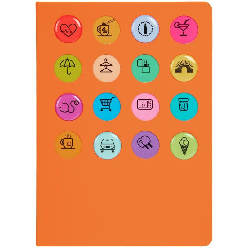 Обложка ежедневника из материала Soft Touch. На корешке обложки выполнено блинтовое тиснение, обложка дополнена вырубкой с печатью на бумаге и полимерными наклейками под смолой.