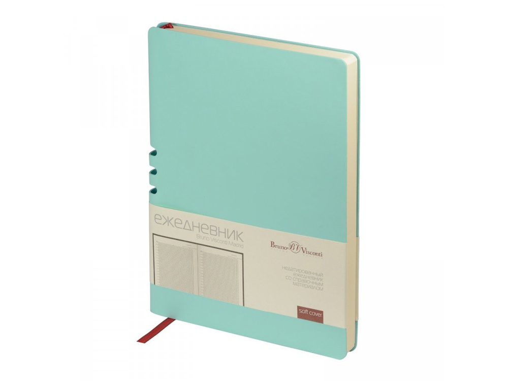 Этот ежедневник вдохновлен солнечными днями и томными ночами Мадрида. И как этот великий город он лишь намекает снаружи на свои тайны. Так, вырубка на спинке – это удобная петля для ручки. Пользоваться этим секретом – одно удовольствие. Недатированный ежедневник Madrid от Bruno Visconti исполнен в модном зефирном мятном цвете. Гибкая обложка с покрытием Soft-Touch. Бордовое ляссе выгодно прекрасно сочетается со скругленной обложкой и бежевым блоком. Для изготовления данного ежедневника использована бумага плотность 70 г/м. Справочная информация на 17 страницах. Ежедневник упакован в картонный полукороб и термопленку.