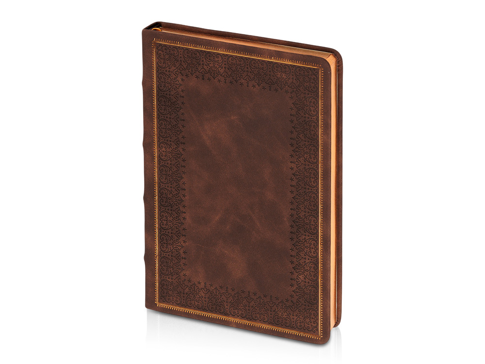 Недатированный ежедневник Royal формата А5 с твердой обложкой из искусственной кожи с имитацией нубука украшен художественным бронзовым и блинтовым тиснением. Внутри 256 страниц, выполненных из качественной бежевой бумаги в линейку плотностью 100 г/м². Два шелковых ляссе в цвет обреза блока и обложки облегчают навигацию по записям. Французский корешок дополнительно декорирован изящным бронзовым тиснением в виде виньеток. Скругленные углы обложки и блока подчеркивают стильный дизайн изделия, а блеск бронзового обреза дарит ежедневнику благородный и роскошный внешний вид.