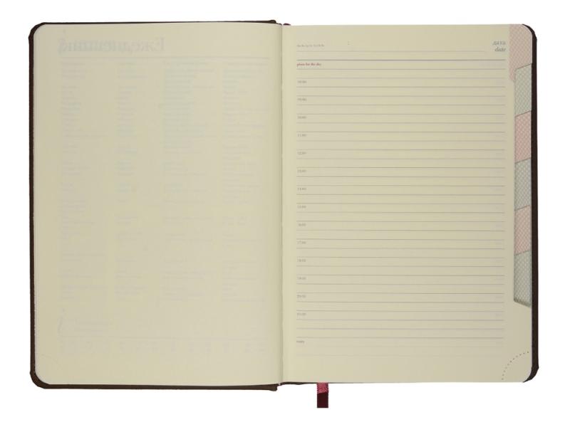 Незаменимый помощник в деле эффективного планирования благодаря высокому качеству производства и тщательно продуманных элементов: мягкая бархатистая обложка со скругленными уголками и строчкой по периметру в цвет, вырубные индексы с цветной маркировкой, разбивающей блок на месяцы, закладка-ляссе, перфорированные углы блока, линовка листов с указанием времени суток.