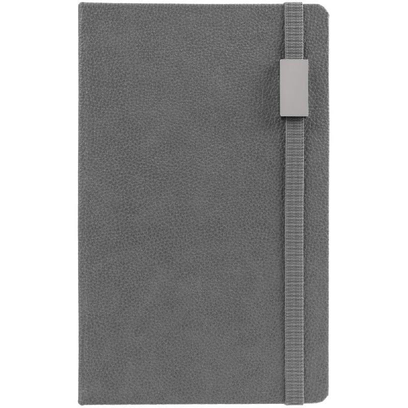 Зауженный ежедневник с прямоугольным металлическим шильдом на резинке.