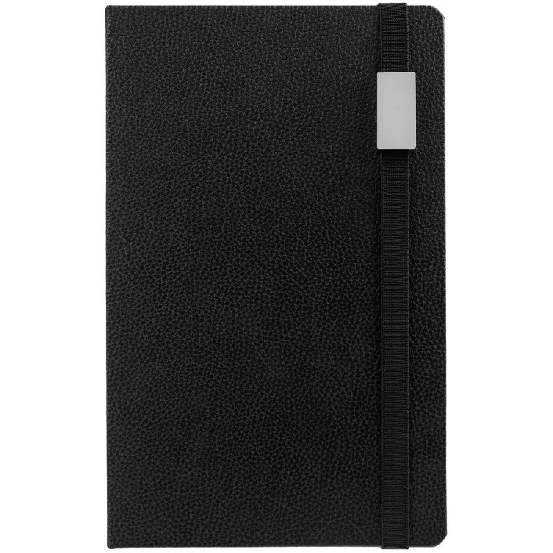 Зауженный ежедневник с прямоугольным металлическим шильдом на резинке.