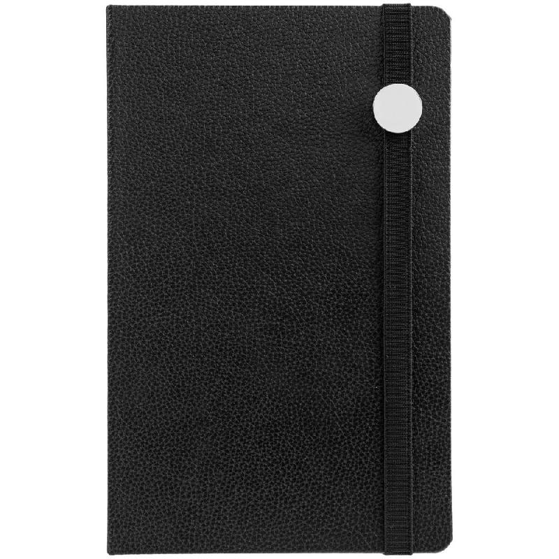 Зауженный ежедневник с круглым металлическим шильдом на резинке.