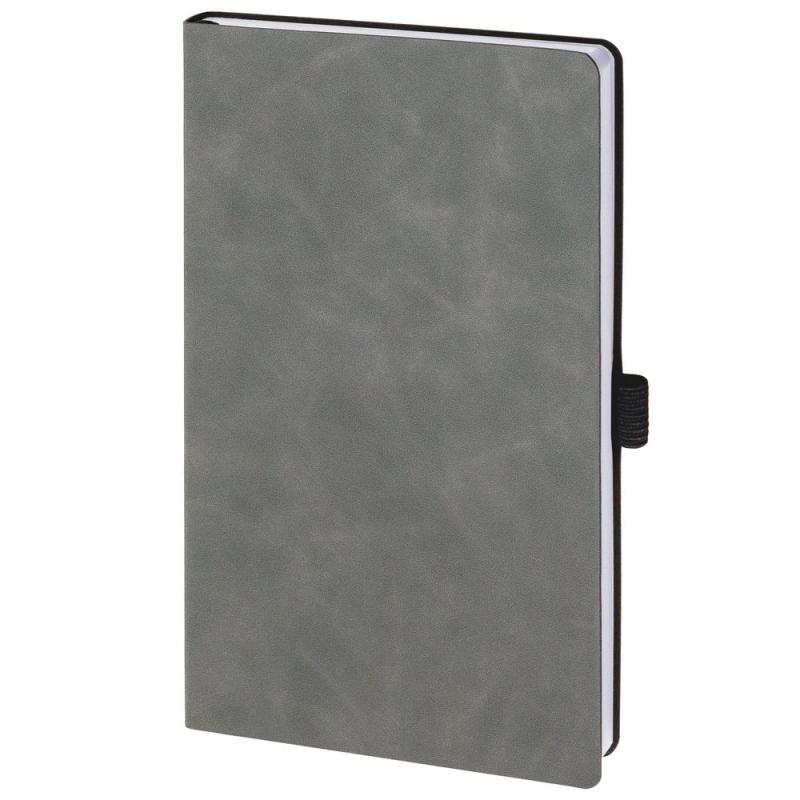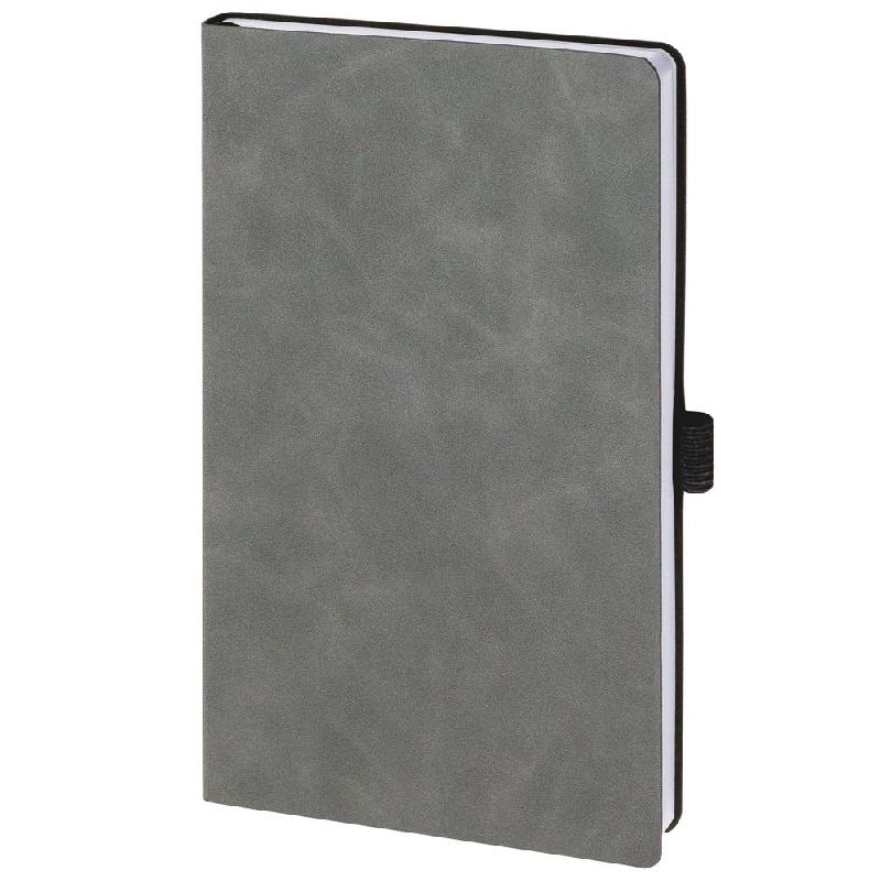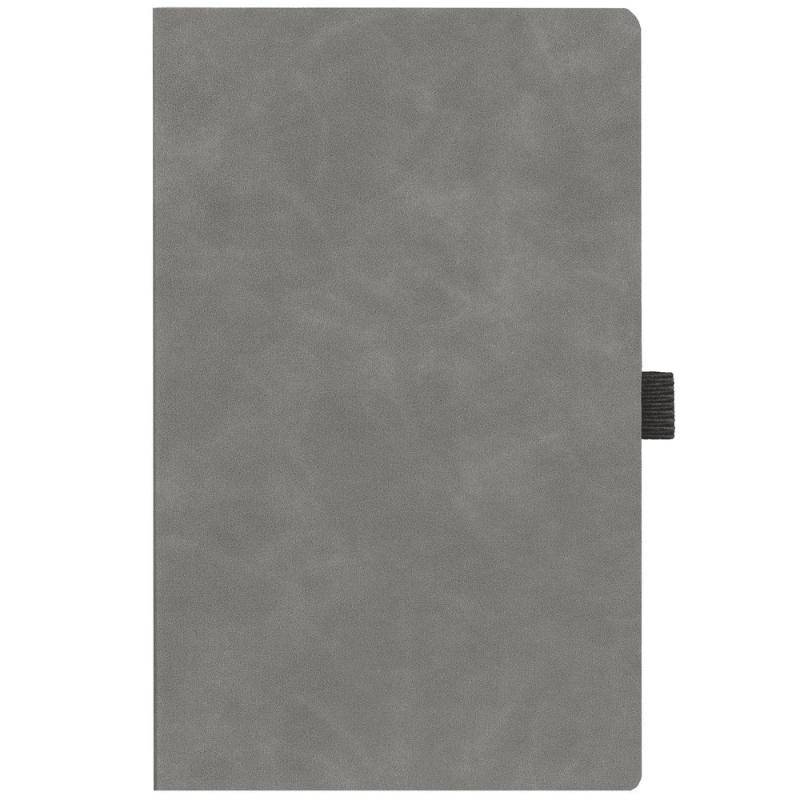 Ежедневник с гибкой обложкой, выполнен из материала Nubuck Touch, серый СС, дополнен ляссе и петлей-резинкой для ручки черного цвета.