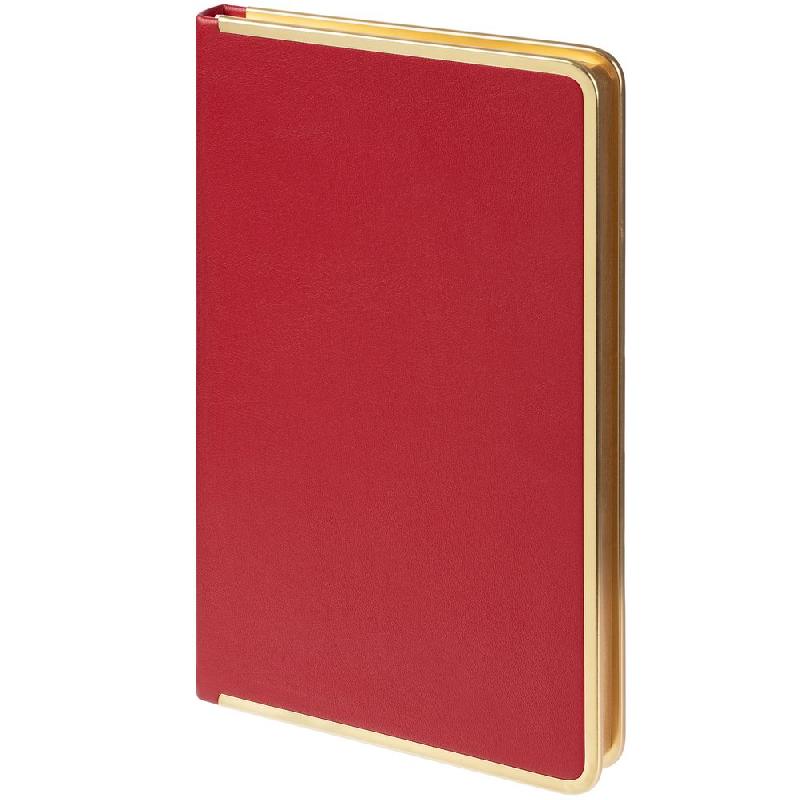 Изящный ежедневник с зауженным блоком и стильными деталями — металлической окантовкой на обложке и металлизированным обрезом.