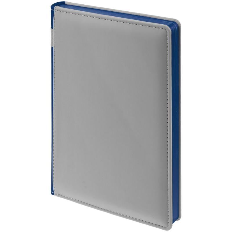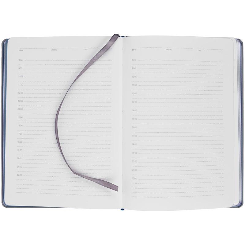 Твердая обложка с поролоном, материал обложки — Soft Touch, серый СС и Soft Touch Ultra, синий НН. На корешке ежедневника находится петля из резинки.