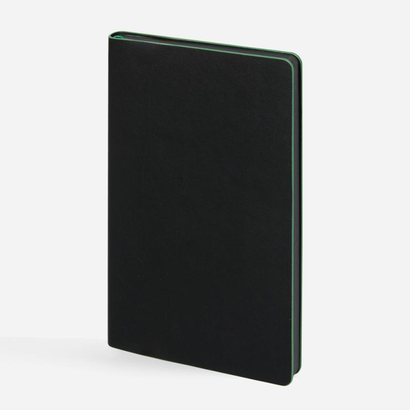 Ежедневник с гибкой обложкой, выполнен из материала Waltz, черный АА, дополнен цветными срезом обложки и ляссе.