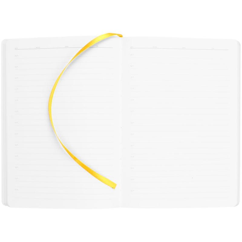 Ежедневник с гибкой обложкой выполнен из материала Soft Touch, желтый KK и Latte, желтый (внутренний материал); дополнен ляссе желтого цвета и фактурным тиснением обложки.