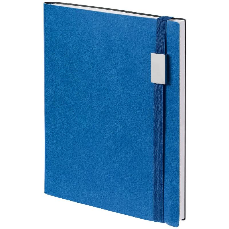 Ежедневник с гибкой обложкой, выполнен из материала Latte, голубой JJ, дополнен резинкой шириной 1 см с металлическим шильдом, капталом и ляссе голубого цвета.