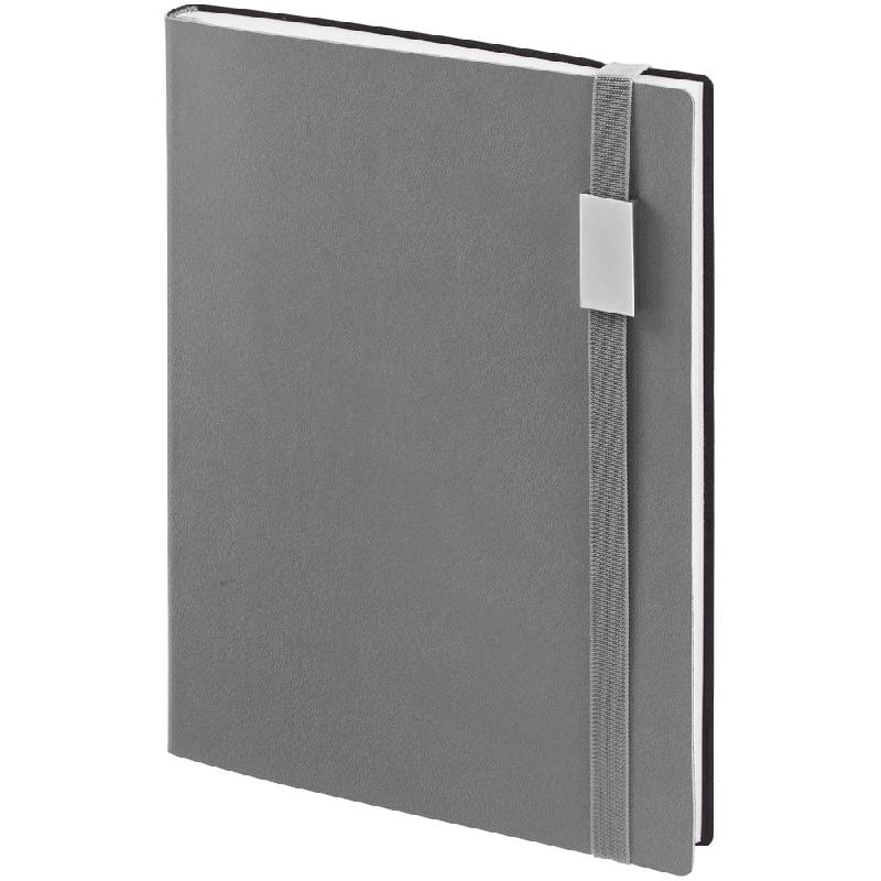 Ежедневник с гибкой обложкой, выполнен из материала Latte, голубой JJ, дополнен резинкой шириной 1 см с металлическим шильдом, капталом и ляссе голубого цвета.