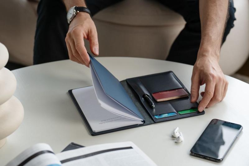 Еженедельник Remini со съемной обложкой-портфолио из натуральной кожи, репсовым ляссе и окрашенным срезом обложки в цвет материала.