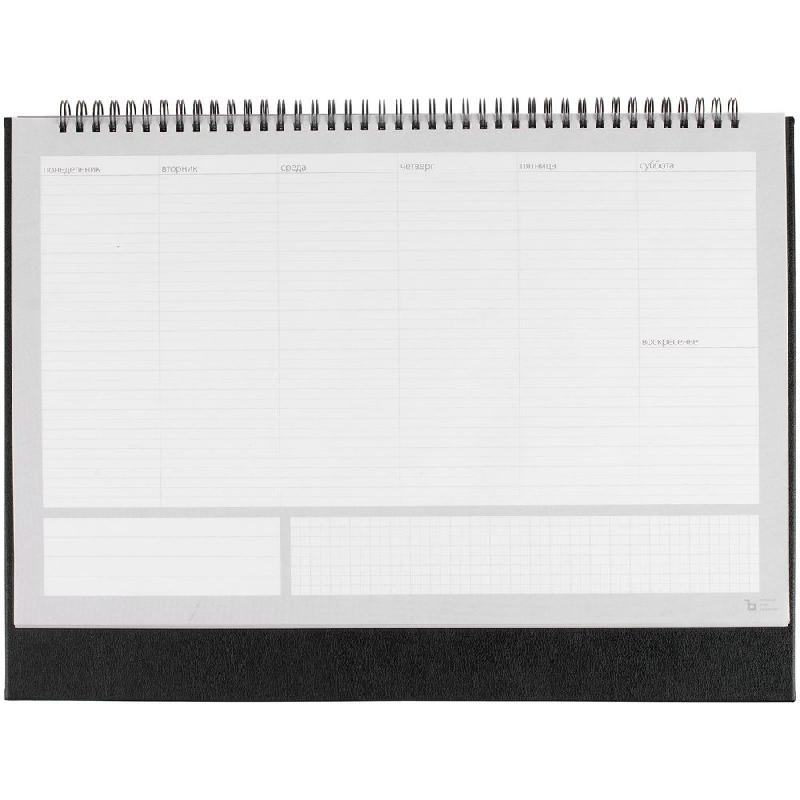 Настольный недатированный планер на открытой пружине. Обложка из белого мелованного картона, подложка из плотного картона в материале Petrus, черный АА.