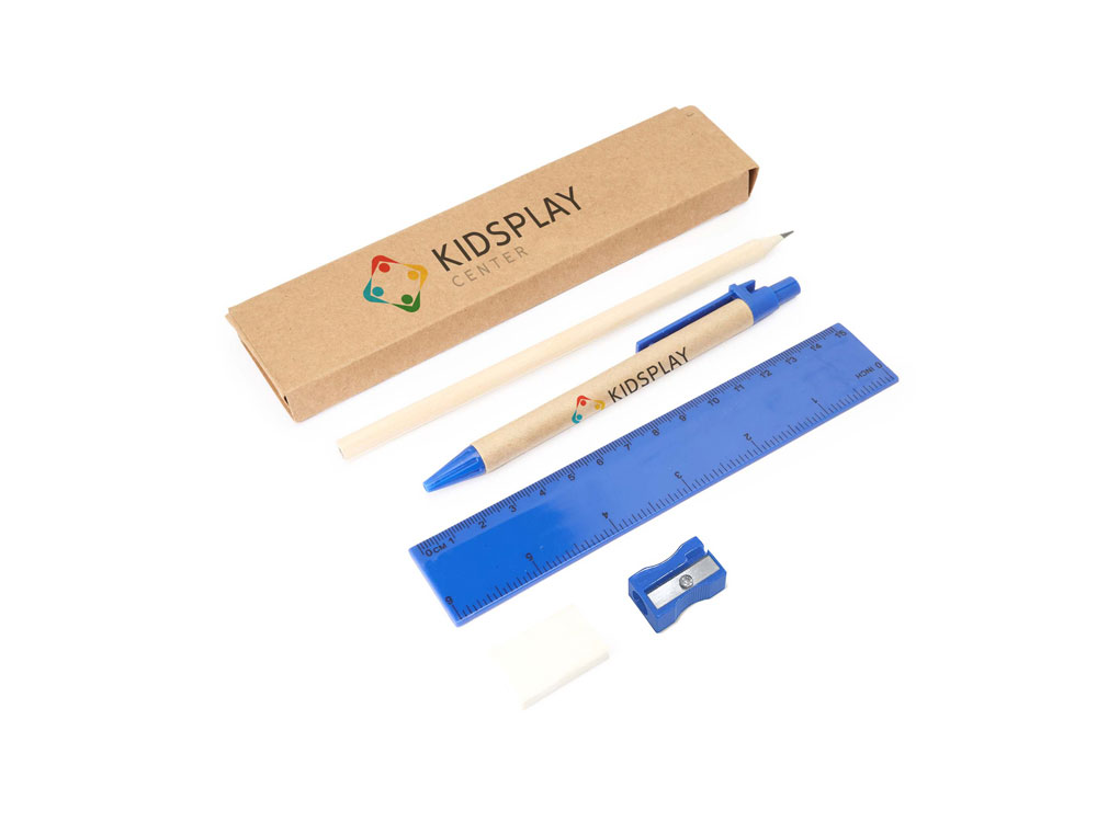 Канцелярский набор. Включает ручку с картонным корпусом и синими чернилами, деревянный карандаш, точилку для карандашей, ластик и линейку длиной 15 см.