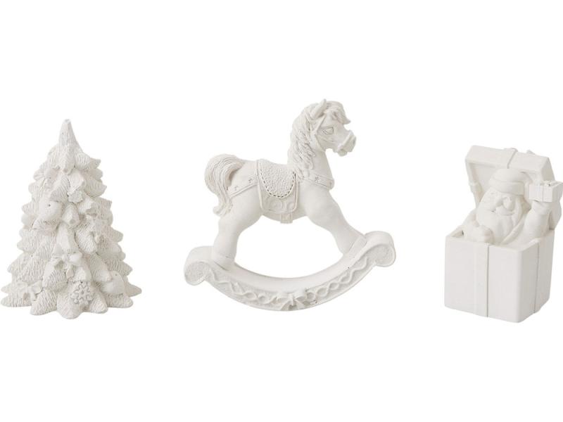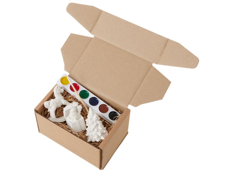 В набор входят три гипсовых фигурки — лошадка-качалка, елочка и подарочная коробка с Дедом Морозом, а также акварельные краски и кисть.