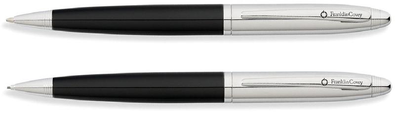 Набор FranklinCovey Lexington: шариковая ручка и карандаш 0.9мм. Корпус - латунь, лак, хромированное покрытие. Отделка и детали дизайна - хром. Цвет - черный + хромовый. Подарочная коробка.