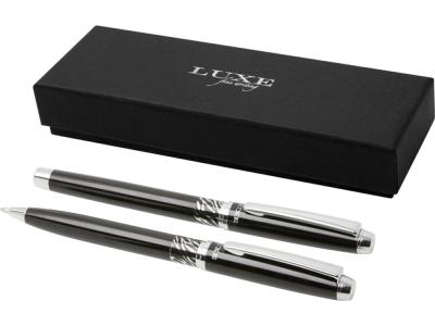Шариковая ручка и ручка-роллер с декоративным узором на корпусе. Шариковая ручка предварительно заполнена синими чернилами, а ручка-роллер предварительно заполнена черными чернилами. Упакована в подарочную коробку LUXE. Латунь.
