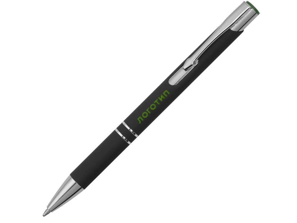 Черная шариковая ручка с кнопочным механизмом и тактильно приятным покрытием софт-тач. Цветная гравировка соответствует цвету кнопки и делает ее еще более изысканным подарком.