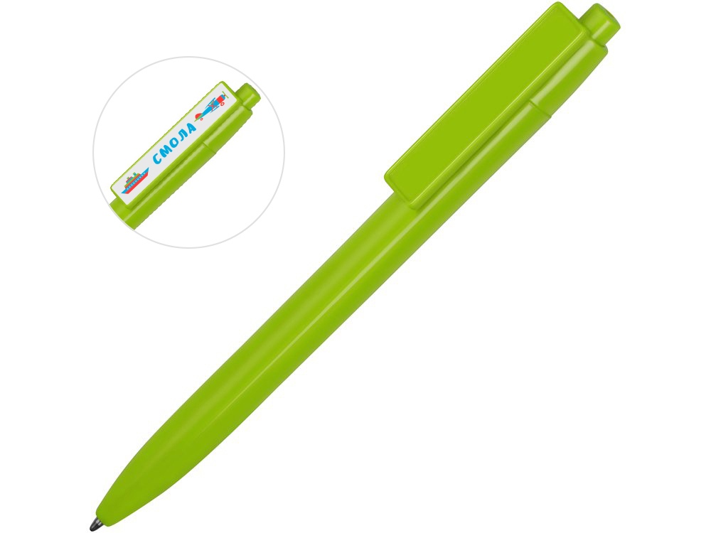 Пластиковая ручка, дизайн клипа которой разработан специально для персонализации в виде заливки смолой. Ручка с этим видом нанесения смотрится особенно эффектно благодаря объемной форме и глянцевому блеску.