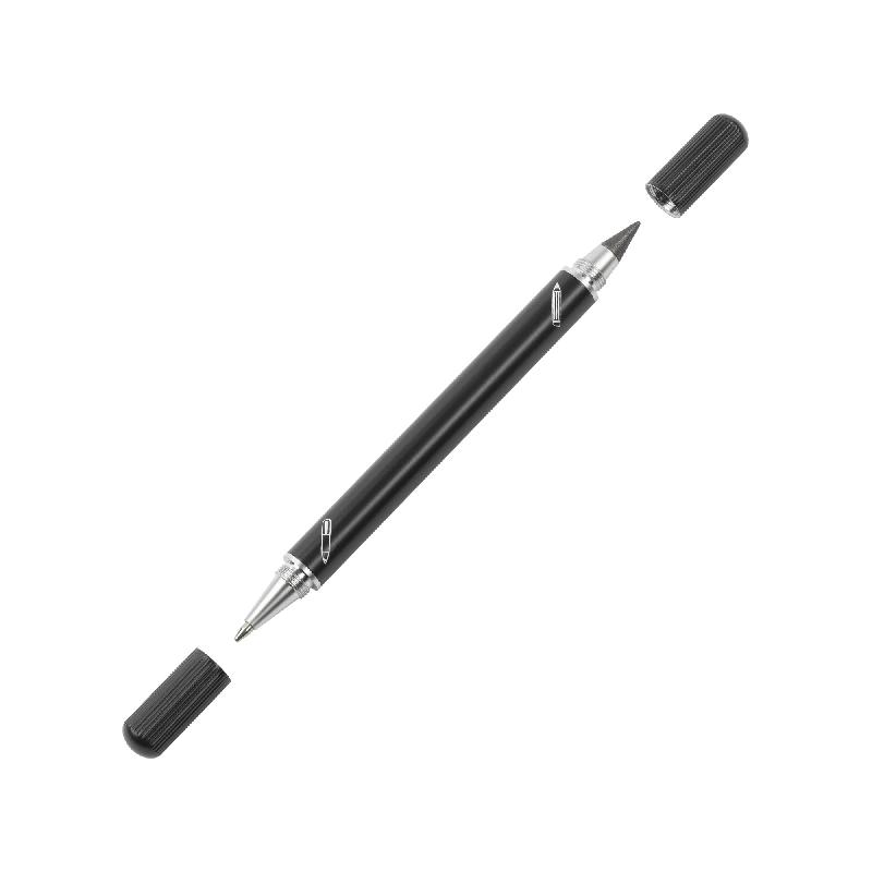 Набор из 2х письменных принадлежностей в едином корпусе - шариковой ручки и вечного карандаша, грифель которого выполнен из сверхпрочного графита с длиной письма до 30 000 метров, Закручивающиеся колпачки надёжно сохраняют пишущие узлы от внешних воздействий.