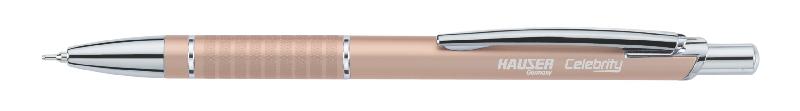 Шариковая ручка Hauser Celebrity, корпус и зажим - алюминий, элементы дизайна - пластик, цвет корпуса - розовый металлик, цвет чернил - синий, толщина стержня - 0,7мм, упаковка - индивидуальная картонная коробка с пвх окошком и европодвесом, 6шт/уп