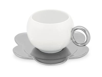 Необычной формы фарфоровая чашка на 220 мл и чайное блюдце в виде цветочка образуют оригинальную чайную пару, из которой очень приятно пить кофе или чай. Нежная бело-серебристая цветовая гамма позволяет нанести достаточно яркую персонализацию и превратить чайную пару в часть корпоративной атрибутики.