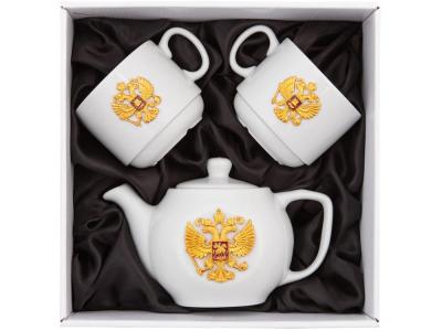Подарочный набор фарфоровый с чайником Россия. Фарфоровый чайник и две фарфоровые чайные пары с серебрянной отводкой края чашки и блюца декорированная металлическим барельефом Двуглавый орел. Материал барельефа сплав алюминия с декоративным покрытием под серебро и отделкой эмалью. Емкость чашек 220 мл., ёмкость чайника 500 мл. Ручная работа.