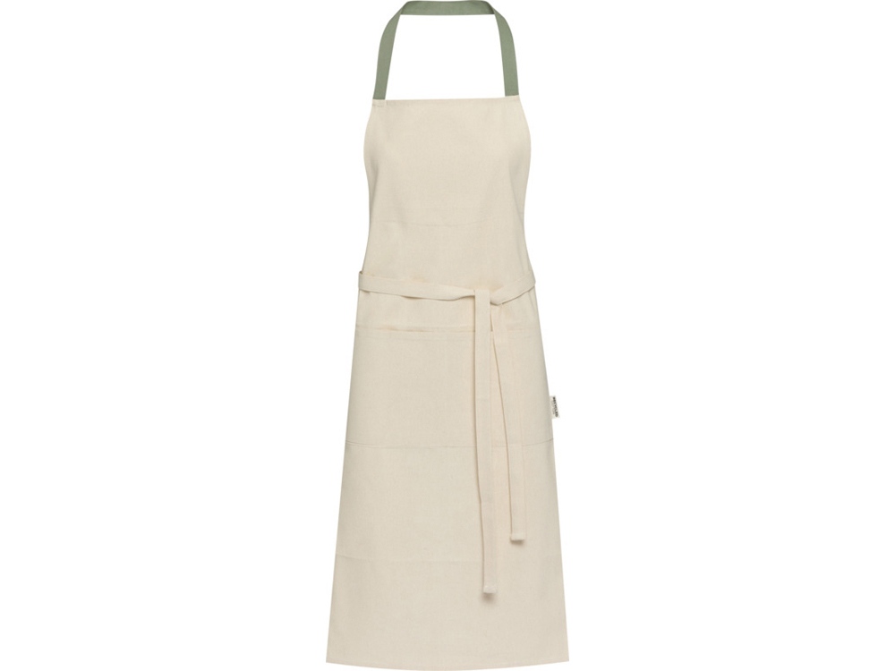 Фартук Nia изготовлен из 100% сертифицированного GRS переработанного хлопка плотностью 200 г/м². Этот фартук из натурального хлопка с контрастной петлей на шее защитит вашу одежду во время приготовления пищи. Фартук Nia с двумя соседними карманами общим размером 45 x 20 см и завязками длиной 1 метр обеспечивает обеспечивает практичность и стиль на вашей кухни. GRS certified recycled cotton, 210 g/m2.