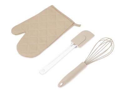 Набор Canele состоит из трёх предметов, без которых не обходится приготовление ни одного пирога или торта: венчика для взбивания яиц или крема, лопатки и прихватки для горячего.