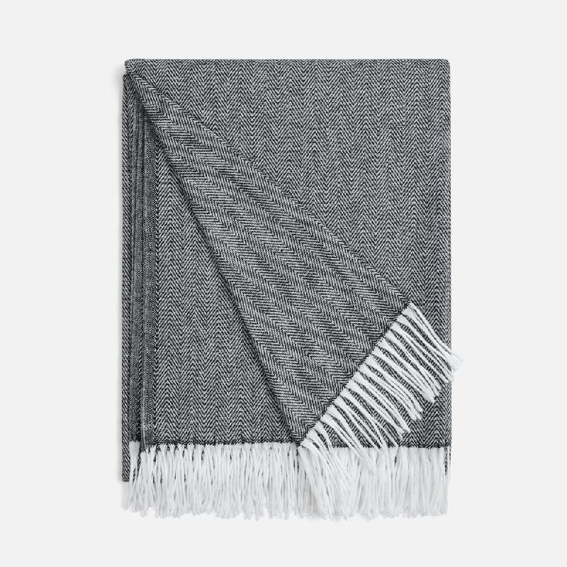 Классический рисунок «елочка» не слишком привлекает внимание, но в то же время добавляет изюминки. Смешанный состав пряжи продлевает срок службы и существенно облегчает уход за пледом.