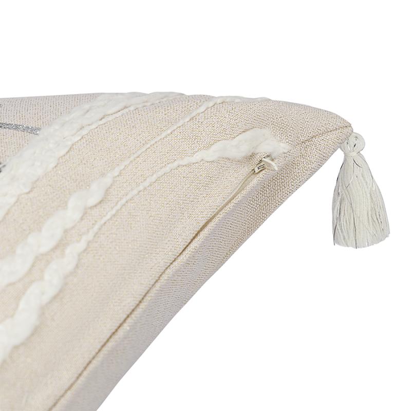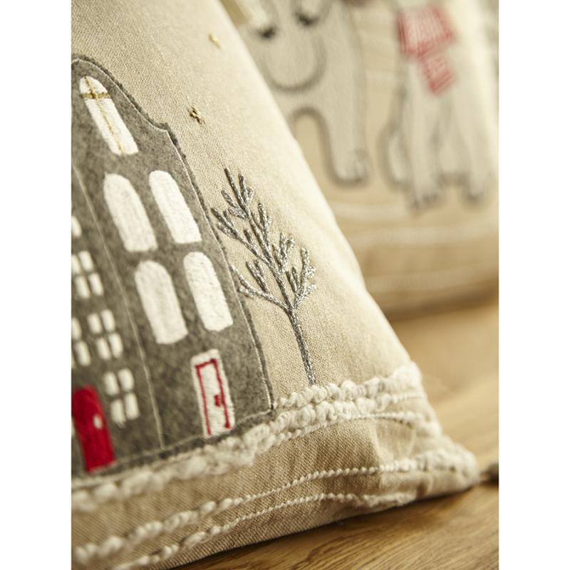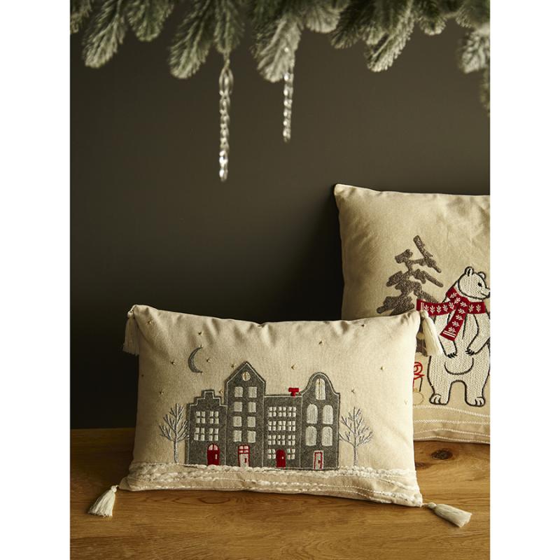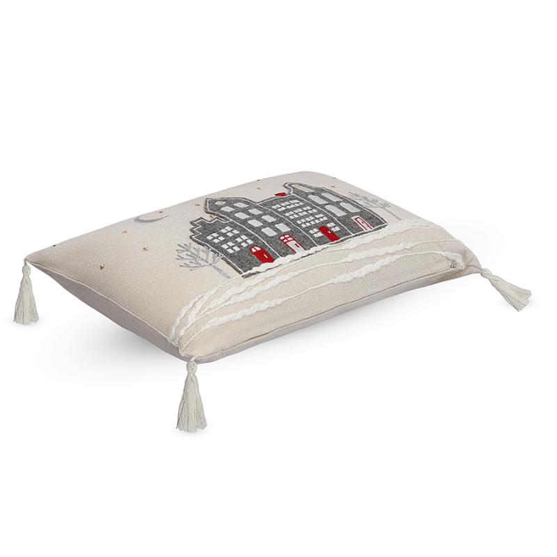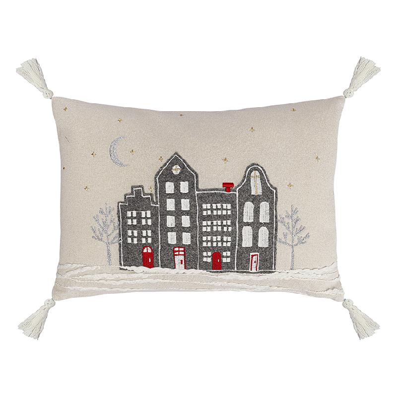 Подушка декоративная Snowy Town из коллекции New Year Essential добавит нотку волшебства в любое пространство, создав в нем атмосферу теплоты и уюта. Изображение заснеженных домиков и декор в виде кисточек дарят приятные эмоции и оживляют дизайн. Подушка идеально подходит для гостиной, спальни или детской комнаты.